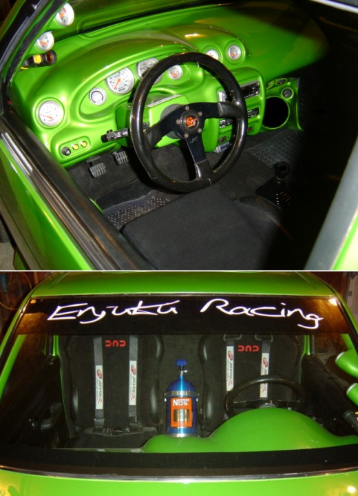 Fiberglass dash with Auto Meter Ulta Lite gauges, Oil Temp, Nitrous Pressure, Air Fuel Ratio, Oil Pressure, Tach, Speedo, Water Temp, Fuel level, Boost Pressure, Fuel Pressure, EGT Temp and Voltmeter. Auto Meter Shift Light. 14 point roll cage, Kirkey Racing Seats W/ impact 5 Point harnesses
