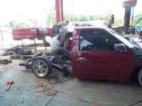 bagged with 1/2 smc valves and reversed triangulated cantilever with new frame from the motor back made out of 3x3x1/4" for a 3" stock floor body drop...yep stock hood and possibly stock bed...we'll se about that one