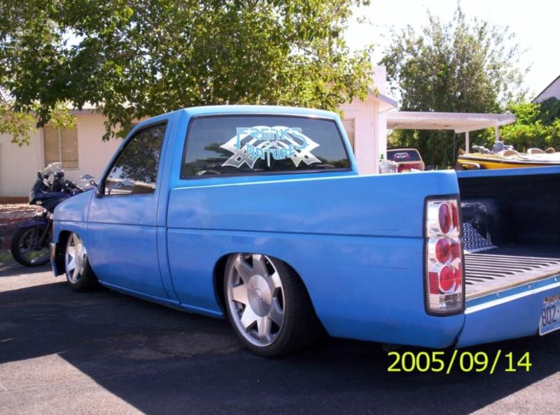 Shaved handles/ antenna. Toyota front bumper and valance. Custom flame stalked motorcycle mirrors from V-Twin (mounted on the factory mirror mounts). Euro taillights. Rear bedsides flared 1 inch to fit wheels. Diamond plate notch cover in bed.