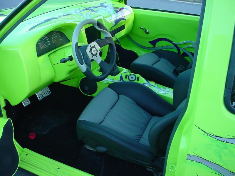 Recaro seats, MTX speakers, etc. One-off door pulls. Completely molded interior (the kingcab to the walls and headliner, etc. ACC carpet. MOMO shifter and steering wheel, PS2, Raw Screen
