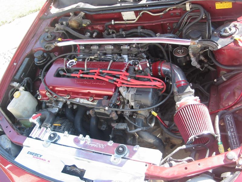 SR20 2.0 air intake, header, 2 1/2 in exhaust, JDM intake manifold, spacers, APEXI SAFC. Optima battery relocated to trunk