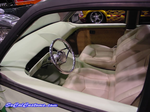 dakota digital gauges, steel dash wrapping onto door and console all shaved floor molding into rockers dash console and kick panels custom sheetmetal, chrome ididit steering column, Custom <ST> B.A.D. steering wheel, custom hand fabricated gangsta swirl door panels, cheese dick upholstered seats