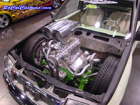 chrome-starter pulleys valve covers air filter radiator hoses oil pan holley blue fuel pump King Demon 850 carb custom aluminum fuel cell