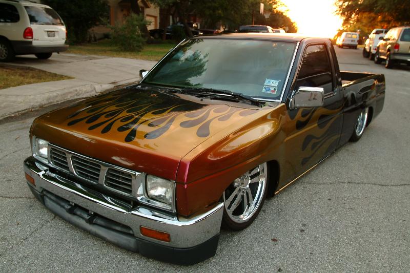 fully shaved with supra tails in the rear and an led third brake light in the cab. Painted nissan charcoal grey with dupont pure fire flames