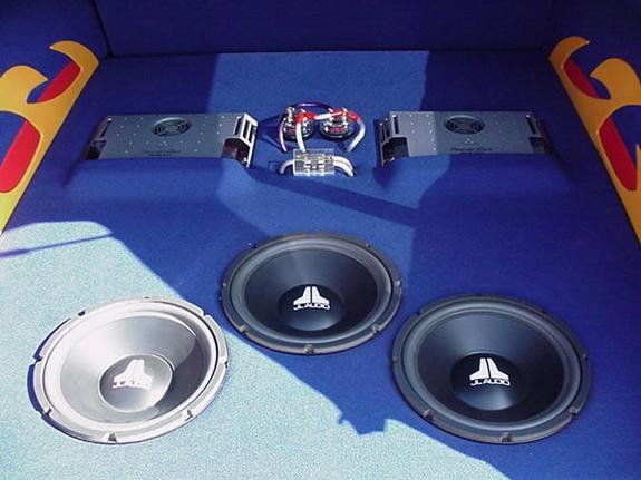 Panasonic head unit with 7" flip up screen, 6x9's , tweets, 3 12" JL subs, all pushed by Phoenix gold amps..