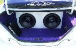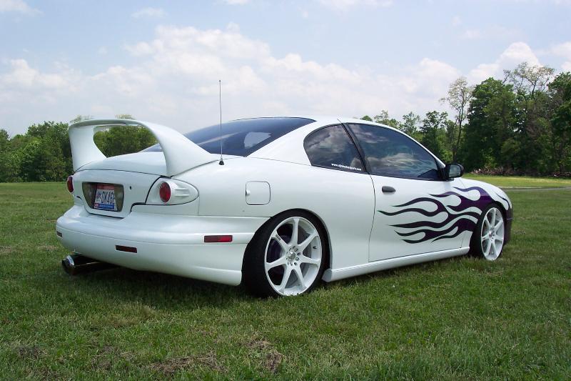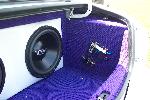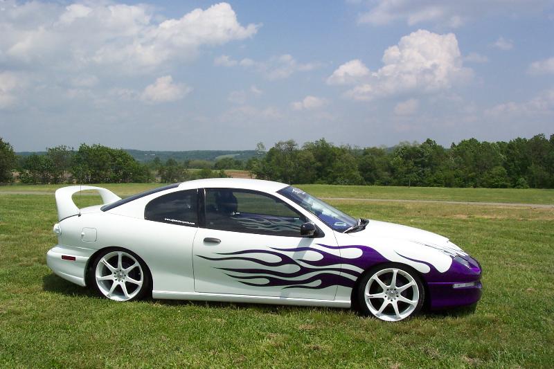 White with pearl purple in the clear with passion pearl purple flames.Wings West Super Style Wing, 35% window tint with custom graphics,ion blue headlights, purple neon underbody lights, Omega alarm system