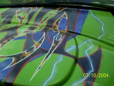 -custom tribal airbrush on hood - yellow and black cheetah, carbon fiber, blue marble, and lightning