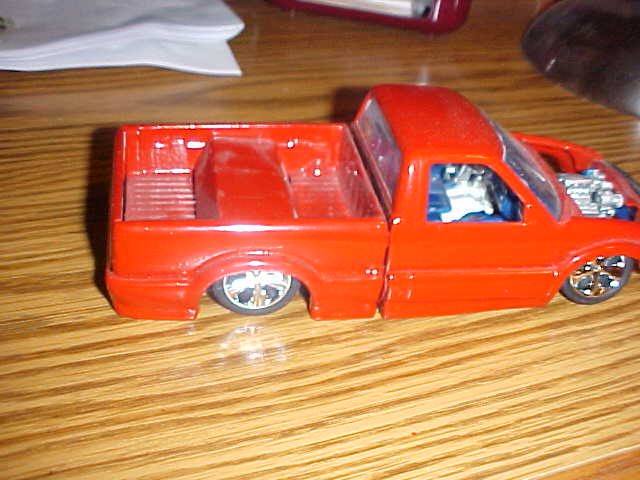 red, shaved doorhandles, tailgate handle, rollpan, body dropped.