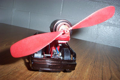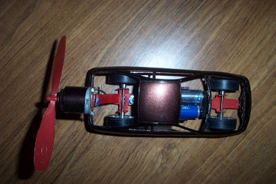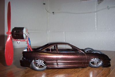 This is a project I had to build for a high school physics class. We had to construct a small vehicle powered by an electric motor and a fan. I used the body from a model Integra and built the frame from aluminum.
