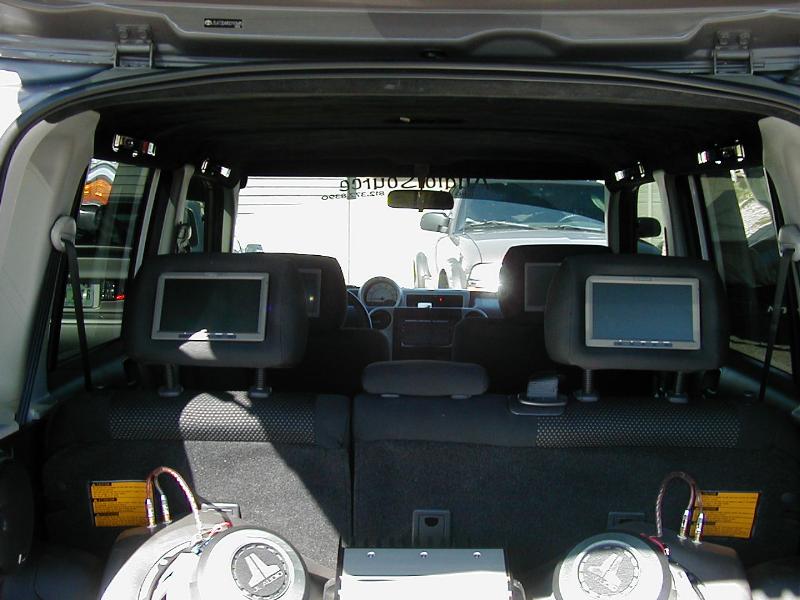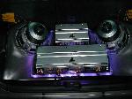 kenwood double din touch screen, 4 headrest, 2 JL w6 in a custom box, JL 250/1, JL 1000/5, both mounted on plexiglass with leds under to light up the glass.