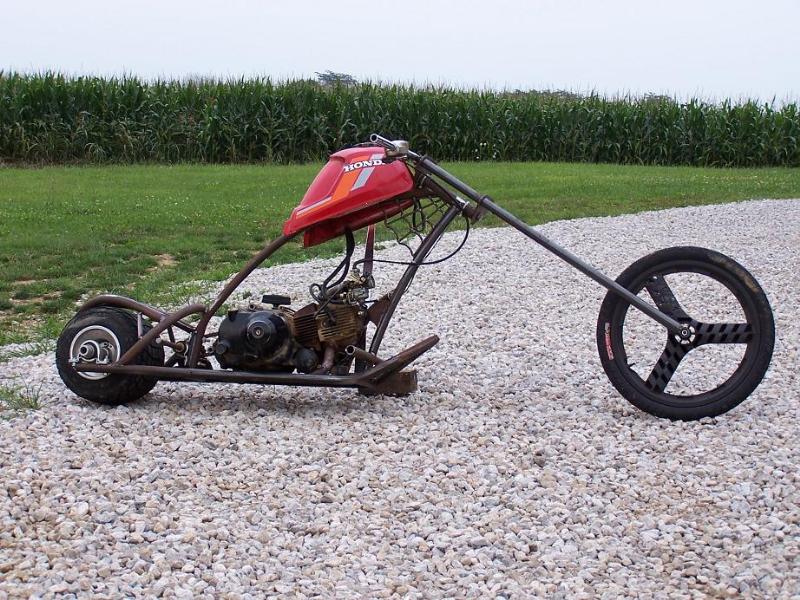 85" long, curved upper and lower backbone, 56 degree rake, 3 wheeler gas tank for now, building a new tank now, spiderweb gusset, and seat pan, jackshaft, and rigid as a mofo. Drag bars Tops out at 54 MPH