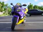 Fully polished frame,swing arm, and wheel dishes. Stock Yamaha Paint scheme but in non-stock colors (no...not because it's been down.) was red and white, now it's yellow and purple (stickers and all)