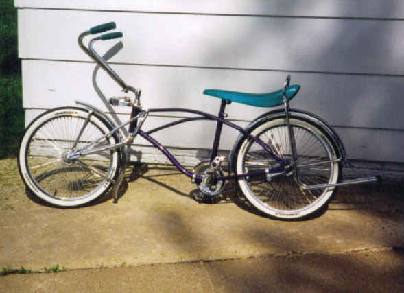 the frame is a firestone frame that my dad had as a kid, it painted 2001 ford purple metallic with green seat and grips, I still have the orginal handlebars