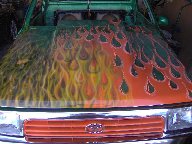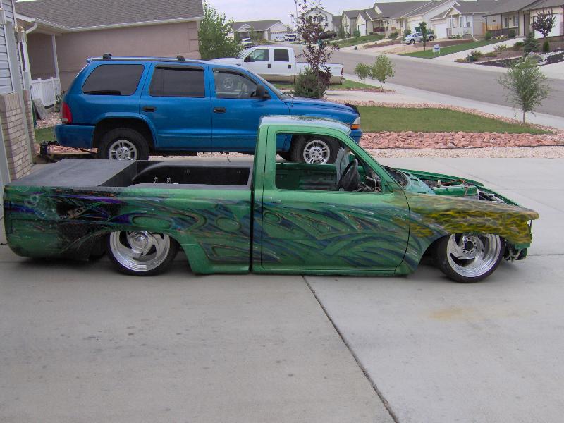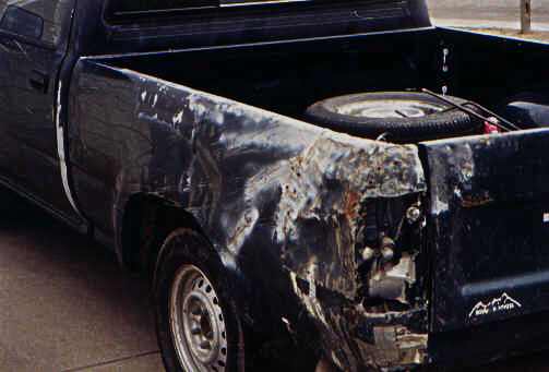 truck was a rolled total when i bought it 2inch bondo on roof cab sides bondoed with doors to make them straight 1-3 inches there the guy never tryed to fix the bed but looking at it why try? now it has a new cab 2 new doors new bed new fenders new hood new rad support new lights O did I say that every piece of metal was taken off the og body and trashed now to what is done to the new stuff. 3 inc body drop,4wd fenders,shaved firewall,doors, used 96 civic clutch master and yes it fits and works perfect,92 4runner front bumper and lights. sui doors ssd kit works really good .Well I cut the hell out of the firewall for the rhd thats done and ready for paint.I just started the sheet metal work in the bed. Fiber glass cowl hood unlimited products took 3 1/2 month to get. Then 2hrs to make the latch work so it would shut. Im not that happy with the hood. Smoothed cowl. GETTING PAINT NOW!!!