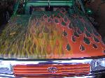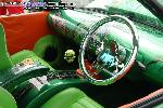 celica bucs green vinyl with a trol hair insert,headliner green trol hair, Door panels orange vinyl and green trol hair , Over head console houses the alpine radio and is orange vinyl and green trol hair, carpet will be green,dash is painted and blank no gauge no radio no nothing moved the ignition switch from column to a nice hidden spot.billet wheel,and misc painted parts. behind seat sub box that houses 2 pioneer 12" subs in a ported port thought cab box. With a fiber glassed face and center console finishing touch.