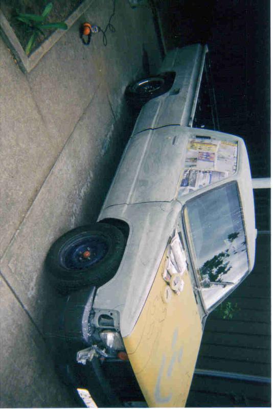 Was a Midnight Metalic Blue and then an undercoat gray. Now a Jet black and Burnt Orange. With a nice big hole cut in the bonnet, pushbike mirrors and a welded up tailgate