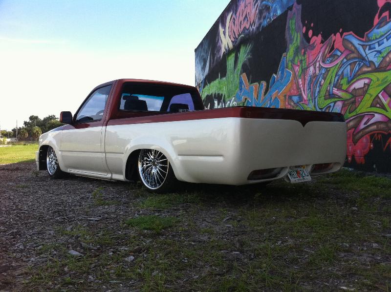 Two tone copper up top with some flake and escalade pearl white on the bottom. Shaved rear tailgate Toyota Supra brake lights molded in to bottom roll pan. Shaved handles, squirters, gas door.