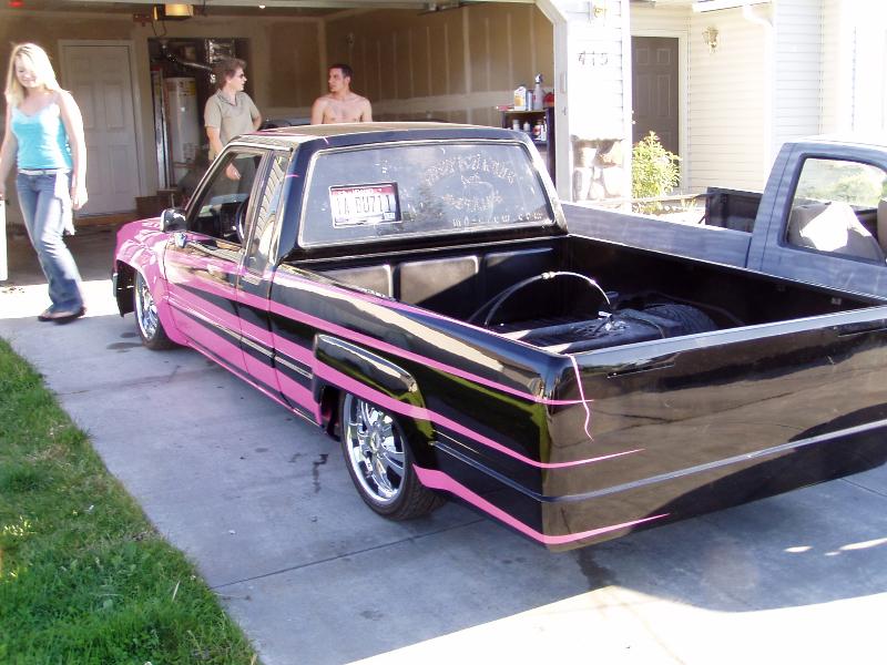 Shaved: Door handles, antenna, hood squirts, 3rd brake light, emblems, tail lights. Full skin combo, lexan window, 4Runner bumper and grille, chrome side mirrors, flush mount fiberglass tanneau however the hell you spell that... 3" body drop