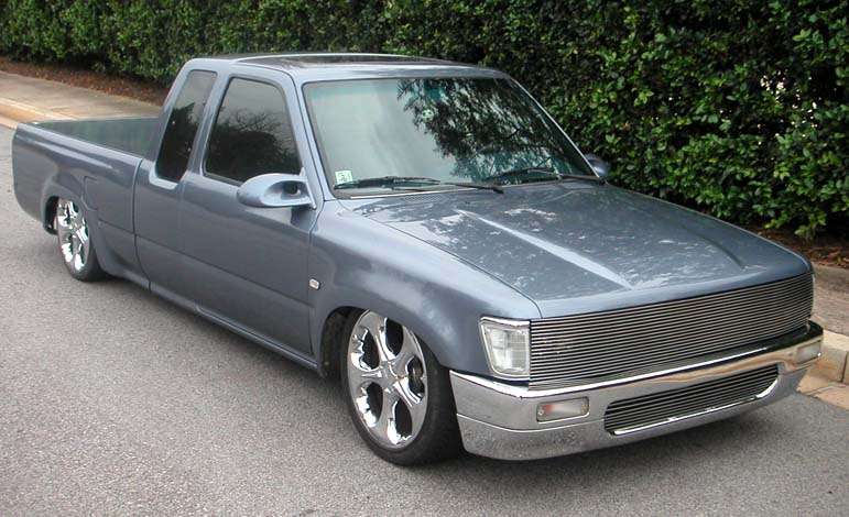 Phantom grille with diamond back headlights behind it. 4x4 fenders with clear lenses, side markers. Chrome bumper/valence with billet insert. Celica mirrors. Tinted windows. Tacoma Altezza tail-lites molded in. LED 3rd Brake light. Tailgate skin with angled plate box. Rollpan. Shaved doors, antenna hole, gas door lock, rock guards. Sunroof. BMW Steel Blue Metallic paint!