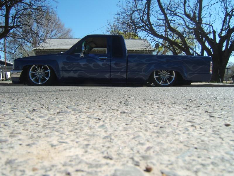 Two viair 480's, 8 smc 3/8 valves w/ 1/2 inch line, 8 gallon air tank painted to match, 2 re8 bags in the rear and 2 re6 in the front. 2"drop spindels