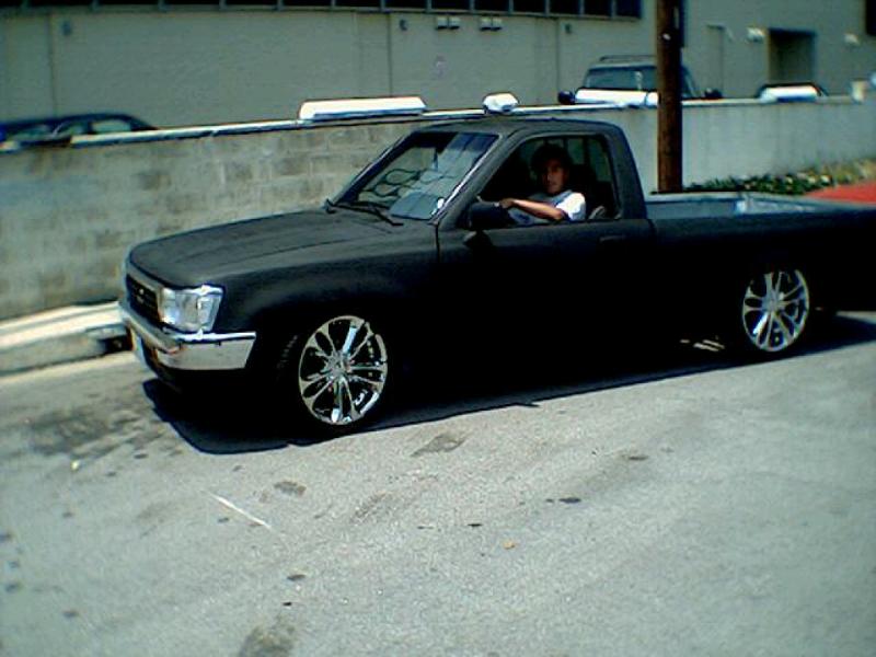 full 95 4runner front, clear corner and bumper lights, 4x4 fenders, shaved rocker holes, antenna, door handles, tailgate handle, 3rd brake light, hood pissers, welding in and molded rollpan, custom license plate, gaylords bed cover. 5% window tint with mirror flames (but changing the design..this was just a practice tint)