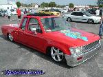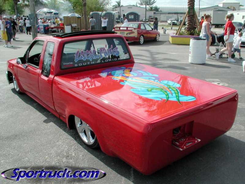 Toyota Super Red paint, graphics on hood, cowl and tonneau cover, shaved:hood squirters, antenna, wipers, rock guards, tail lights, tailgate, door handles and gas door. suicide doors, l.e.d. tail lights, flip down tag in the tailgate skin with the new gas door behind it, sliding ragtop, fiberglass tonneau cover, 4x4 fenders and all chrome 4x4 bumper, valance and grille with billet insert