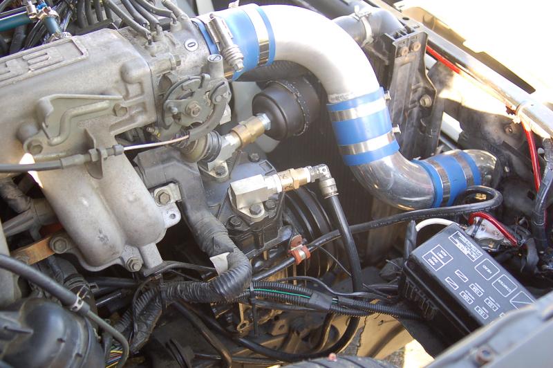 Stock 2.4L 22RE, Custom Garrett GT25R turbo setup, TiAL blow-off, AEM F/IC,intercooled, custom intake, relocated wire harnesses and items over inner fenders, inner fenders removed completely, clutch master cylinder relocated beneath dash, relocated Optima battery (yellow top), fully TIG welded Magnaflow exhaust, relocated gas tank beneath bed, Clutch Specialties Stage 1 clutch disc/pressure plate, DOA Racing timing chain with metal guides, Garrett boost gauge