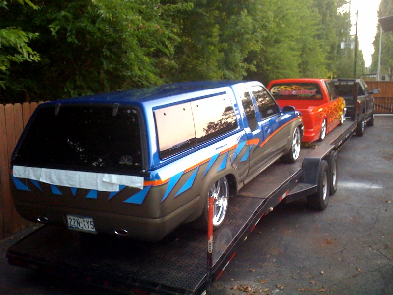 Rear GM door handles, tailgate skin with body line,shaved tail lights, Hagan tail lights, phantom grill, shaved marker lights Shaved squirters, shaved blinkers in bumper,shaved cowl vents, Leer shell, True blue pearl with Chevy Pewter. Graphics by Maxwell Designs. Paint by Kustom Werx.