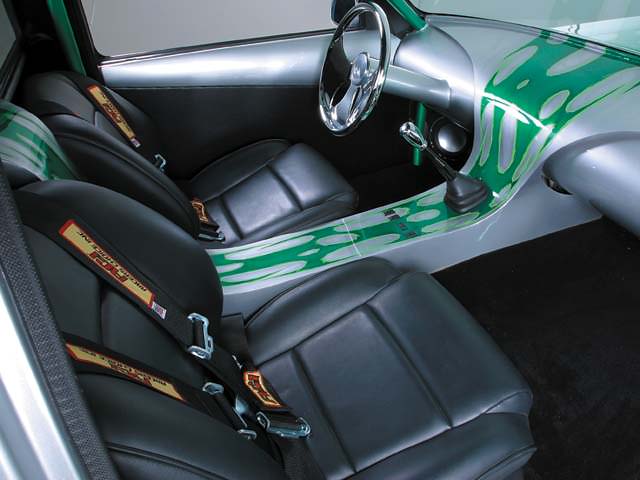 Hand-fabricated steel dash and center console painted to match the exterior. Seats are out of a '96 Honda Prelude sans headrests with modified seat mounts and wrapped in black pleather. Additionally, the door panels are pleather-wrapped Masonite with inserts that make the door panels flow into the dash. See the killer steering wheel in the truck? You can't buy it. It was built from a barstool "borrowed" from Josh's parent's house. The center is a piece of plate steel. Once combined and made to fit a stock wheel, the wheel is held to the column via the factory hub nut. The rear frame clip is tied to the in-cab roll cage, a la race truck style, and painted to match the green tribal found all over the truck. The center console is also of Josh's own design, made to flow to the dash, as well as to house the truck's wiring and stereo components.