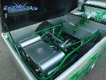 Up front, the suspension has been detailed to death with plenty of Glasurit Silver and a custom-mixed Green. The front has been 'bagged using smaller Firestone airbags, running 1/2-inch lines to SMC valves. Additionally, the frontend was given an additional 2 inches of alignable drop using a pair of Belltech dropped spindles, and Doetsch Tech drop shocks. In the rear, things really get busy with the factory rearend a mere memory. In its place, an '86 Nissan 300ZX rearend makes everything fully independent, with larger Firestone airbags mounted above the upper control arms with flame-cut flame-shaped mounts built into the tubular rear subframe. Since the 300ZX lower control arms serve as the lower 'bag mounts, Josh gets a full foot of articulation in the rear when the rear shocks are removed.