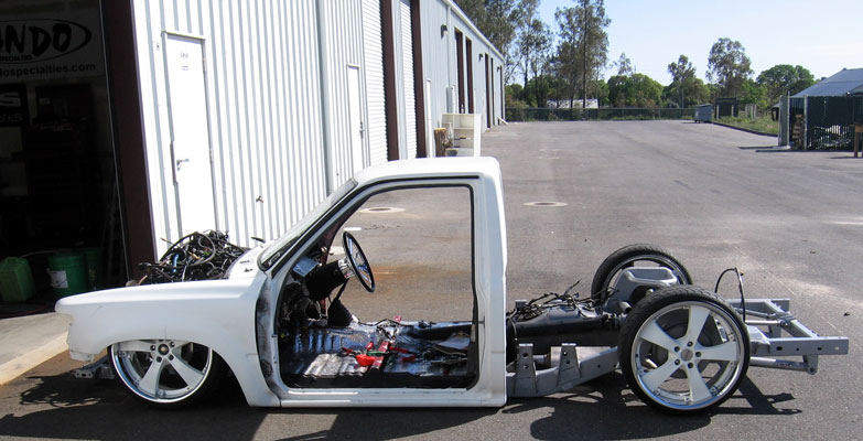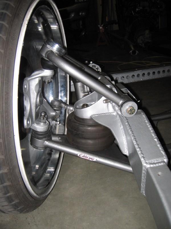All work performed in house at CanDo Specialties. Started with a stock frame. CanDo Specialties Bag on bar link kit, 8.5" Notch, Tranny x-member, Tubular A-arms.