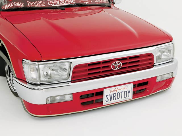 Before flames continue down the side of the truck, it starts out as a straight line all along the bottom of a Toyota 4 Runner valance and skips over a chrome and red 4 runner front-end and onto Toyota 4x4 fenders.