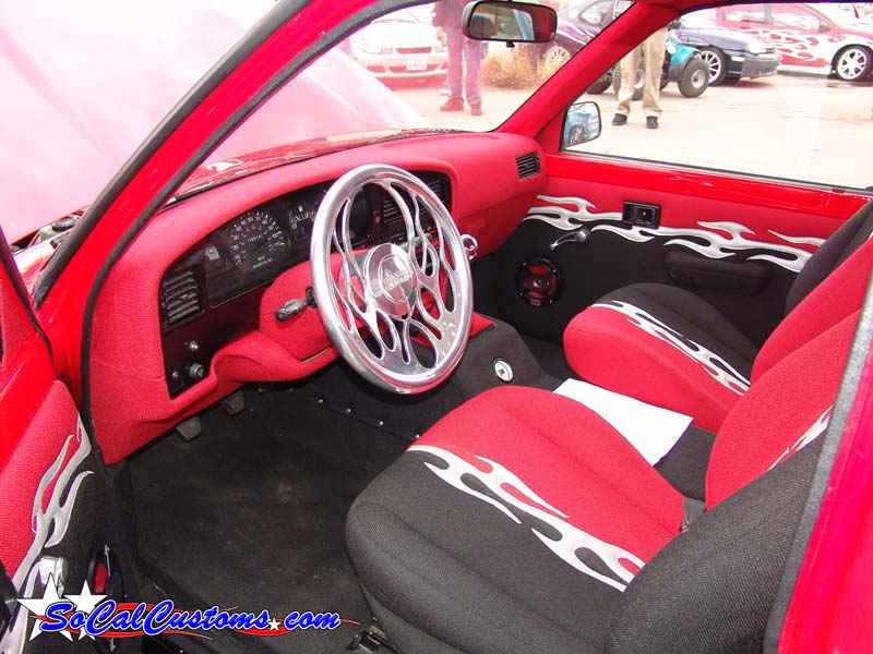 Everything wrapped in Cardinal Red and Black tweed. Door panels and 95 Honda Civic Seats are Red and Black with Silver Carbon Fiber flame to match exterior paint. Seats and Panels done by American Auto Apholstery in Corona, Ca. My Dad made the console, and my Mom made the headliner. Everything else was done by myself.