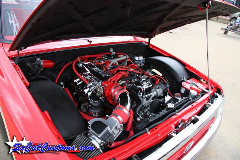 Shawn Canela from Suspension Dimension installed a ceramic coated and polished Pace-setter header and exhaust piping that flows into a flow-master muffler. Shawn also installed hardened steel trailer fenders into the engine compartment. They serve as fenderwells that also helped in setting the firewall tire area back from the tires when the truck is set on the ground. Shawn then installed a CNC polished aluminum brake & clutch cyclinder and pedal unit as the factory brake booster no longer fit. As these mods brought the truck even lower, Shawn notched the steering shaft side upper control arm and also built a new under-oil pan crossmember.