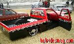The body has been shaved of; door handles, bed rock guards, windshield squirters, cowel vents, antenna hole on fender, 3rd brake light, tailgate handle, tailgate bodyline, tail lights, and gas door. I added a roll pan with LEDs and welded the tailgate shut. I also added a frenced box to the tailgate to hold the license plate. I did most of the bodywork, but had some help from my brother Kevin, Robert Ardy (Browneye), and Ben May (Benji).