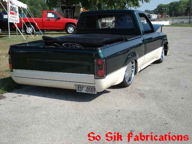 Fully shaved, with a new two tone paint job, 1999 Tacoma green and 2005 VW Bug Biege Sherwin Williams paint. 4x4 fenders, bumper, and grill. Custom sprayed in bed liner that matches the paint.