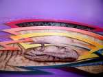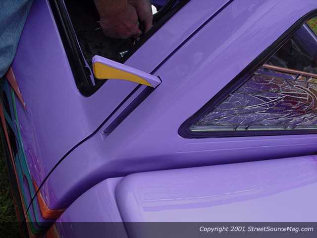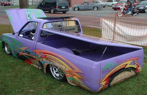 Fully shaved, Custom l.e.d. tail lights Hidden in the graphics, semiphores(turnsignals in the b-pillars), custom mirrors. Custom graphics. "graphic excavation" on the tonnue cover. Custom stained glass rear window. SPECIAL THANKS TO BRAD HOUK FOR HIS WORK ON THE BODY & SUSPENSION.