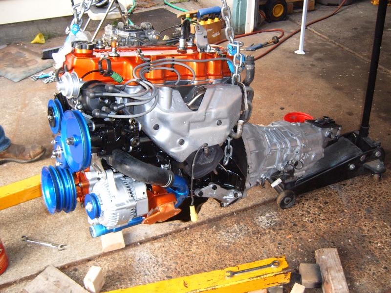 22r bored out to 4" (yes 350 flat top pistons) with badger sleeves, cross drilled water jacket between cylinders for cooling, shaved head with 2 links out of timing chain, OCG cam, centerforce clutch, lc distributor, and many other misc things, painted HOK kandy tangerine & cobalt blue over silver base. OH YEAH!! FITS UNDER THE STOCK HOOD W/O A Z & W/O LOWERING THE MOTOR!!