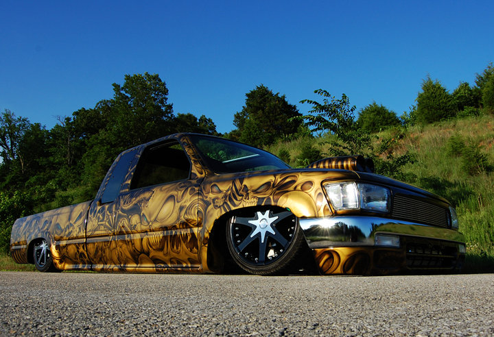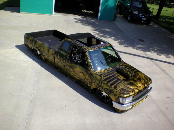 4 and half inch body drop layin on new hand made rockers shaved tails, flush mount leds ,handles ,wiper cowl,ant.,tailgate re shaved ,bed floor ,long bed,4 runner front end with billet grill .and it now has paint! and a simple paint scheme.