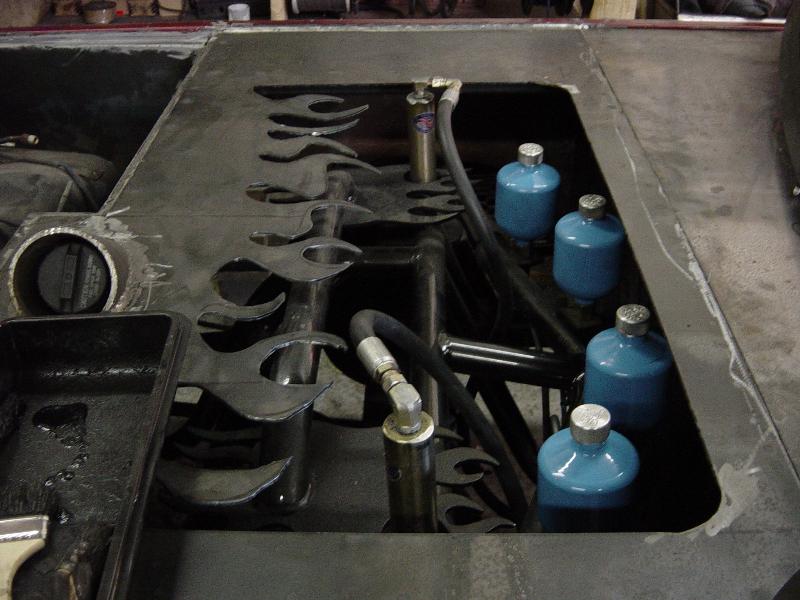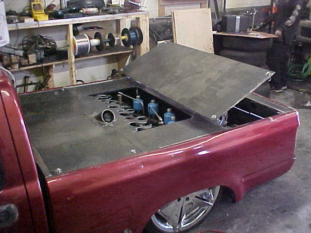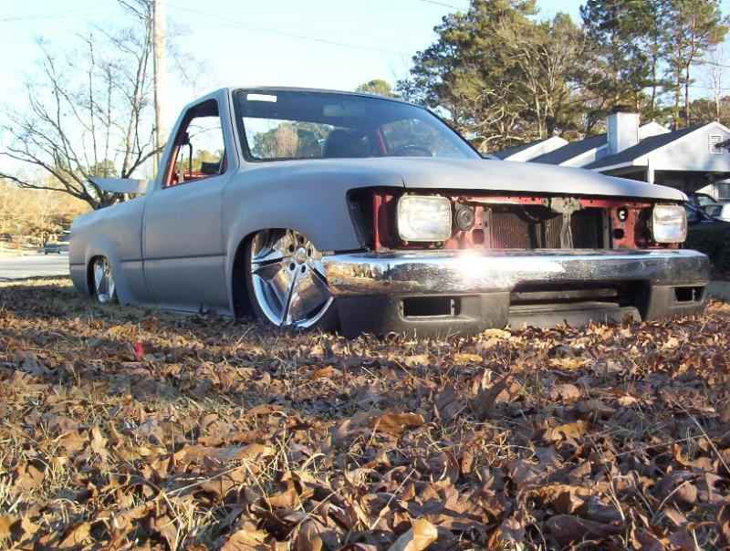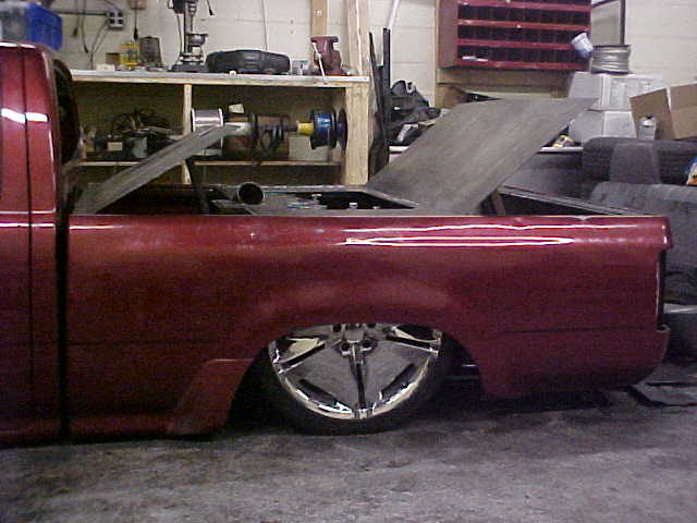 shaved everything,molded cowl into fenders and fenders into rockers,taco front bumper,stock 4x4 fenders,custom sheet metal bed cover with two trunks,box n tube sub frame,tranny crossmember,body dropped n lower'd cab mounts,(b-drop+20's+heat in the north east=cool)