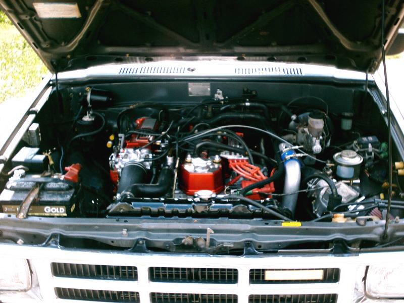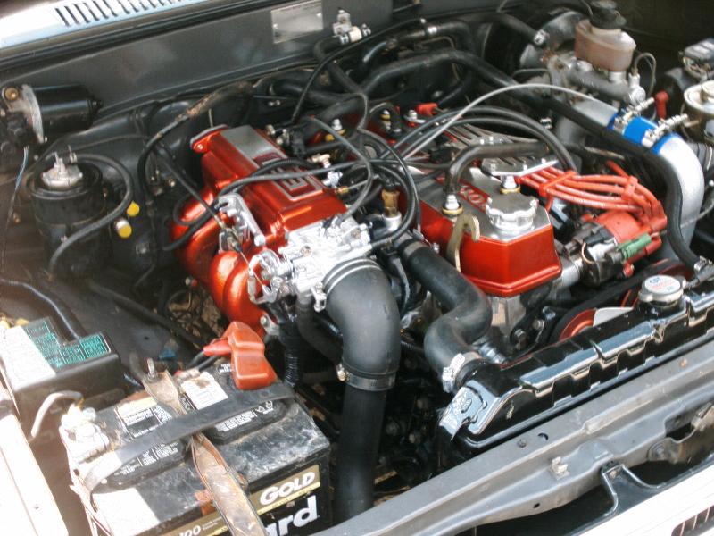22RTE bottom end with a 22RE head, ARP head studs, engnbldr 270 cam, TEC turbo kit, intercooler, and 10psi of boost. Stock 5 speed W58 celica transmission.