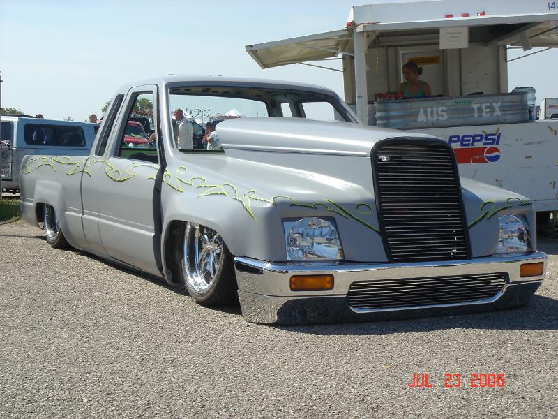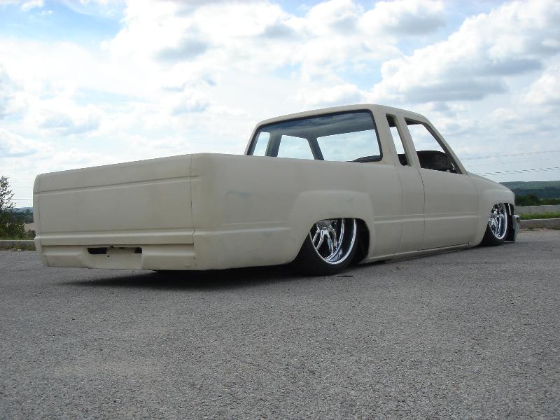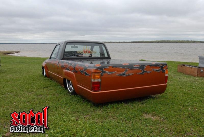 shaved doors, mirrors, wipers, gas door, bed seam, and driprail. closed bed. modified x-tra cab windows. modified, suicide doors. added sunroof and recessed frame. modified 1933 ford coupe hood. custom horizontal grill. toyota tacoma crystal clear headlamps.