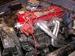 22re converted to carb with a weber, lc eng headers, lc engineering fan painted red to match truck, lc engineering polished water pump pulley, lc engineering billet underdrive pully, lc engineering red powdercoated valve cover, 200 amp gm alternator powdercoated back with chrome pulley and chrome fan, lc engineering polished distributor without vacume advance, billet spark plug wire holder, lc red spark plug wires and cap, msd universal coil, and some chrome and paint in the near future.