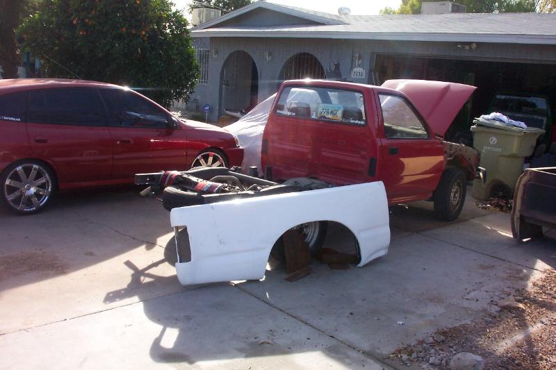 Fiberglass 4" Tacoma Conv. Bedsides, 4wd 4" Flare front fenders, clear corners, Diamond back conv. headlights, billet grille