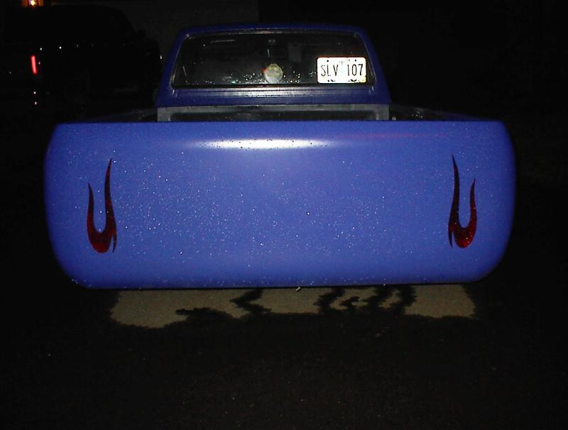 4x4 front end shaved everything doors,gas,tailgate with flame tailights,tail and corner lights and shaved bodyling for that baby smooth look.