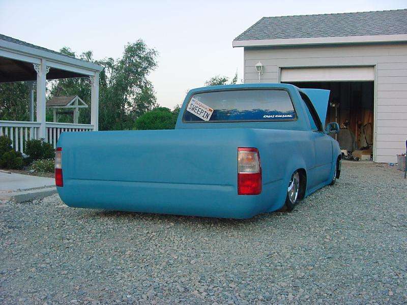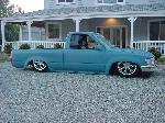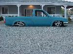 Bodydropped 4 1/4" (a stock floor and stock hood with some mild channeling), grafted in T-100 taillamps, custom combo formed to match the contours of the lights shaved the hell out of it. Custom sheetmetal bedfloor. Shaved firewall.