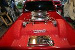 smoothed dash w/ custom gauge insert w/ AutoMeter Phantom gauges, Grant wheel, seat covers, & painted red trim, Odyssey battery relocated to interior, custom console & custom amp & electric panels,custom headliner w/flames laid in
