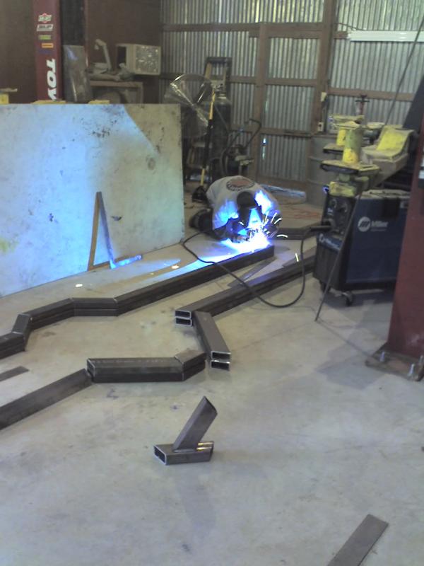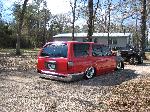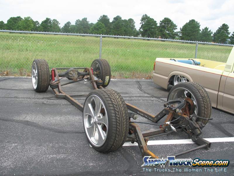 full frame 2x3 box tube,front-tubuler upper control arms, a'd the lower stock arms, belltech spindles and slam bags. rear-93 axle with a 2-link on slams and a custom two piece drive shaft for clearence issues. two viair 480c's with gc valves 5 gallon tank, and aluminum air line.