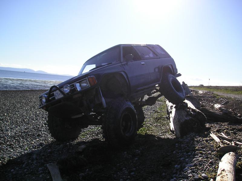 Toyota rear leafs up front, 63" Chevies in the rear with 2" block, OTT Highsteer kit, Steering box moved forward 2" and up 1", Front and rear diff protection, Detroit soft locker in the rear and welded front locker, Custom shock mounts