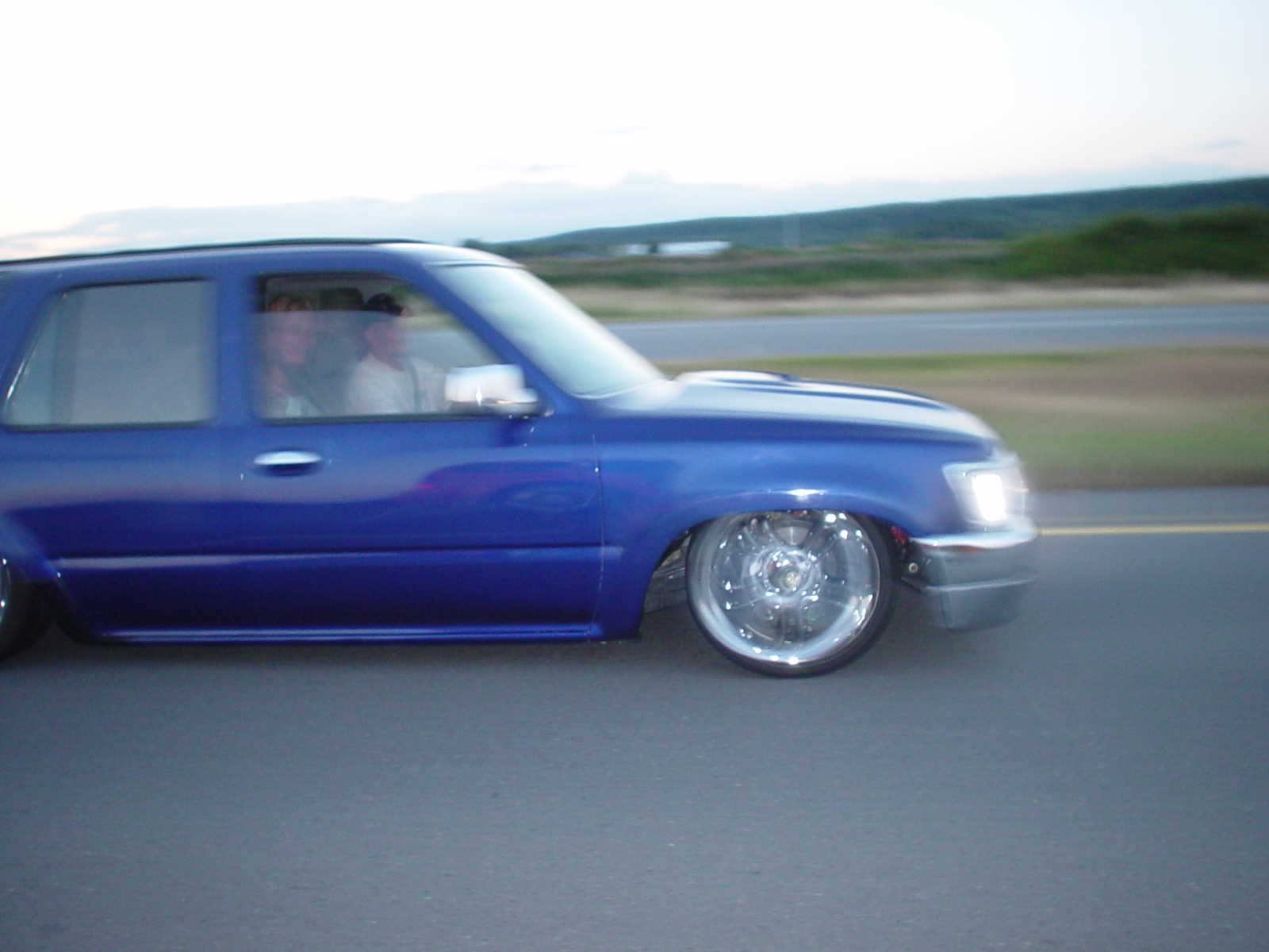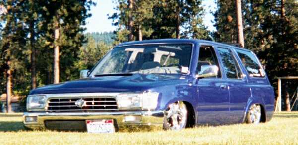 The body work of my IVRunner was all done in my garage, not a shop, so the first order of business was to raise the cab floor a total of three inches to allow IV the marriage of the rocker panels to the ground. To allow clearence IV the motor and to retain a factory appearing hood a Subaru hood scoop was grafted in place. The stock 2WD front fenders were then exchanged IV IVWD units IV better tire clearence. Papa Harry, who helped me with the body work and paint, then completely shaved and reworked the body with a few subtle yet custom touches here and there. The factory front door handles were removed and replaced with a set of Nissan Altima door handles while the rear doors have been void of any such handles. The typical IVRunner rear bumper and rear quarter panels just below the belt line were cut off and replaced with IVWD bed sides and a custom made roll pan. IV a cleaner appearence in the rear the tailgate was shaved and a slanted license plate box with personalized plate (POUNDED) was welded in. The rear tail lights were then shaved and a set of Hi-Tech 6 inch LEDs were installed on the inside of the power tailgate window. Other items that were shaved off the cab include all the emblems, antenna and the fuel door while a huge hole was cut into the roof to allow IV a Street Beat slider to be installed. Once all the body work was done to satisfaction Papa Harry then applied a basecoat of 98 Accura Integra Super Sonic Blue Pearl. To obtain the right depth, he applied several coats of clear and massaged it to a show room shine. Once all the paint work had been completed a chrome IVWD front grill, side marker lights, bumper and lower valance with Billet insert was added to the front. The stock lenses were also replaced with clear units IV an up to date look. I would like to extend thanks to Saturday Joey, Papa Harry and all the Members of the IV EVER LOW Chapter in Idaho ,IV giving their hand in helping me to complete my IVRunner.